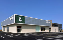 ●大塚 : 鯖江店の時は、行政が一切華美なものは受け付けない。ましてや8号線というメインの道路に面しているならなおさらだと思いますが。法令遵守ということからはじまるわけですけど、街並みがごちゃごちゃしてればしているほど、何かもっとスクエアな、すっきりしたものを作りたいなと思いました。初めてパチンコ店をデザインすることになったんで何か面白いことはないかなと考えていましたら、知人が壁面緑化を始めた時だったので、うまくそれを取り入れながらできないかと思いまして。「自然と融合させて欲しい」というのが、元々の鯖江市のオーダーにあったんで、その言語に乗っかって闘おうじゃないかということで始まったデザインだったんです。鯖江店の時は、本物の壁面緑化を使いアルミと組み合わせてみようと。